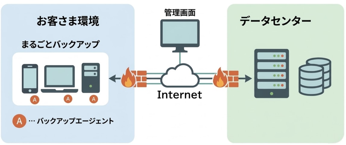 バックアップ元(サーバ/PC/NAS等)にバックアップソフトを導入し、バックアップ対象のフォルダ/ファイルを指定します。専用線は不要で、インターネット経由でも利用可能です。シンプルな操作画面で設定しやすいことを前提としています。