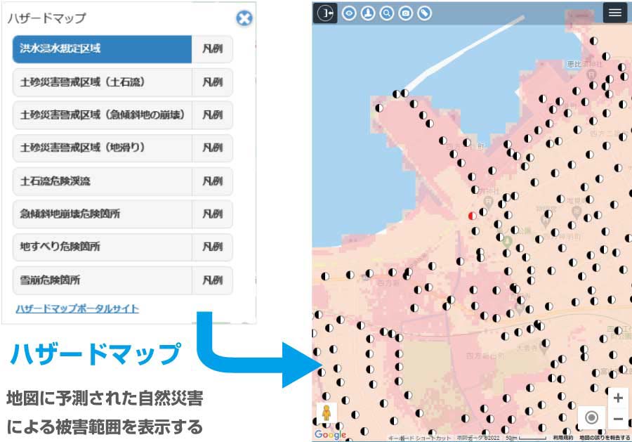 ハザードマップ機能を活用し災害リスクの状況把握、設計時の災害リスク管理に役立てます。