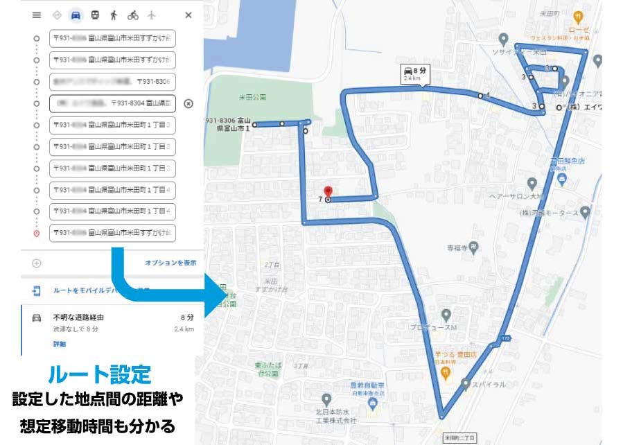 ルート設定機能は、複数の経由地を効率的にめぐるルートを探索できる機能です。さらに、Googleマップアプリと連携することで、探索したルートをナビします。