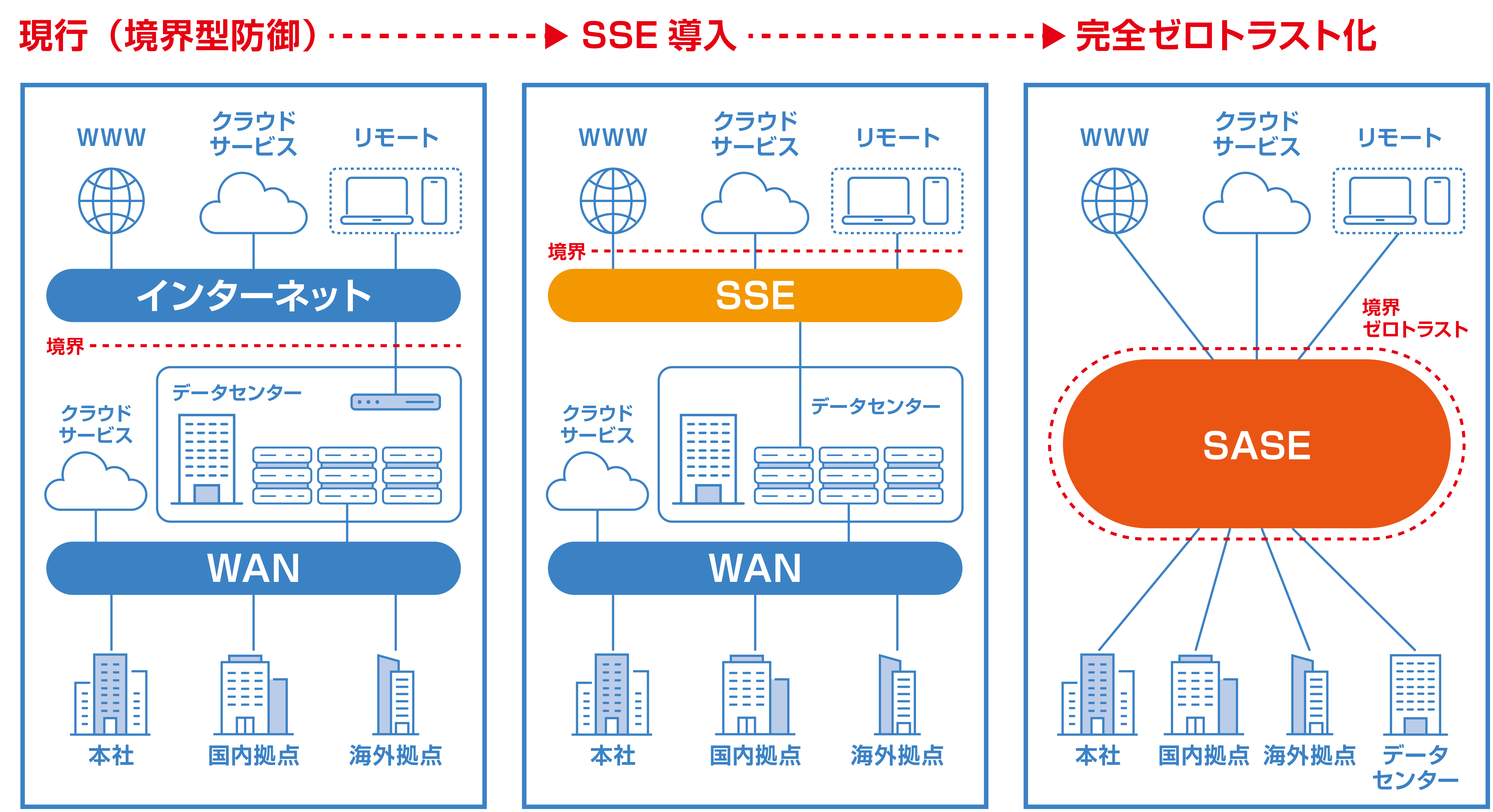 境界型からの転換を第一歩として、SSE/SASEで安全なアクセス経路を確立。レガシーアプリも含めてZTNAで場所に依存しない保護を実現します。「境界型からの転換を第一歩として、SSE/SASEで安全なアクセス経路を確立。レガシーアプリも含めてZTNAで場所に依存しない保護を実現します。」
